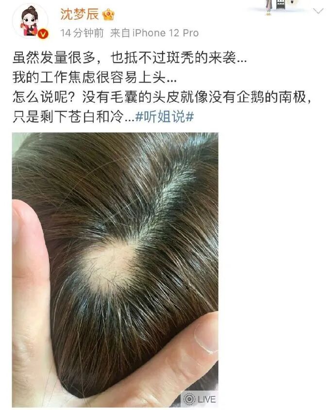 14.继曝自己黑照后,这期《听姐说》@沈梦辰 又自曝曾因工作焦虑到斑秃,生动形象地描述,已经开始有画面感了!还发博晒斑秃照片,调侃自己的头皮像没有企鹅的南极@娱乐神侃