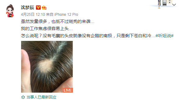 最近,沈梦辰在微博上晒出自己斑秃的照片,还配文调侃道:虽然发量很多,也抵不过斑秃的来袭……
