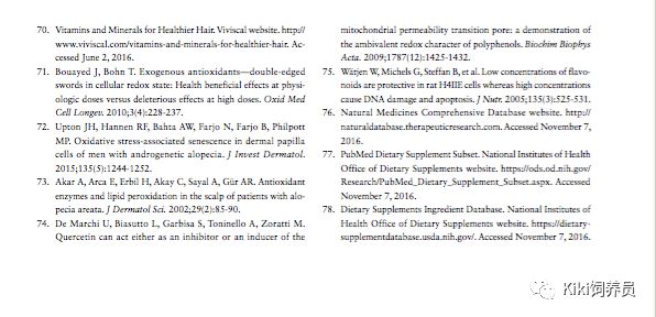 抗氧化剂是能够中和活性氧簇(ROS)、防止氧化损伤的化合物。如前文所述,许多物质可以分类为抗氧化剂,包括锌,硒和维生素A和E,以及维生素C和多酚类物质[71]。氧化压力与脱发有关。来自雄激素源性脱发患者的真皮乳头细胞的体外研究表明,氧化应激可能在秃顶表型和AGA发展中起重要作用[72]。此外,在斑秃患者头皮内源性抗氧化酶和脂质过氧化作用的研究中发现,斑秃患者的头皮中发生过多的自由基生成,伴随着高水平的抗氧化酶,无法防止ROS。