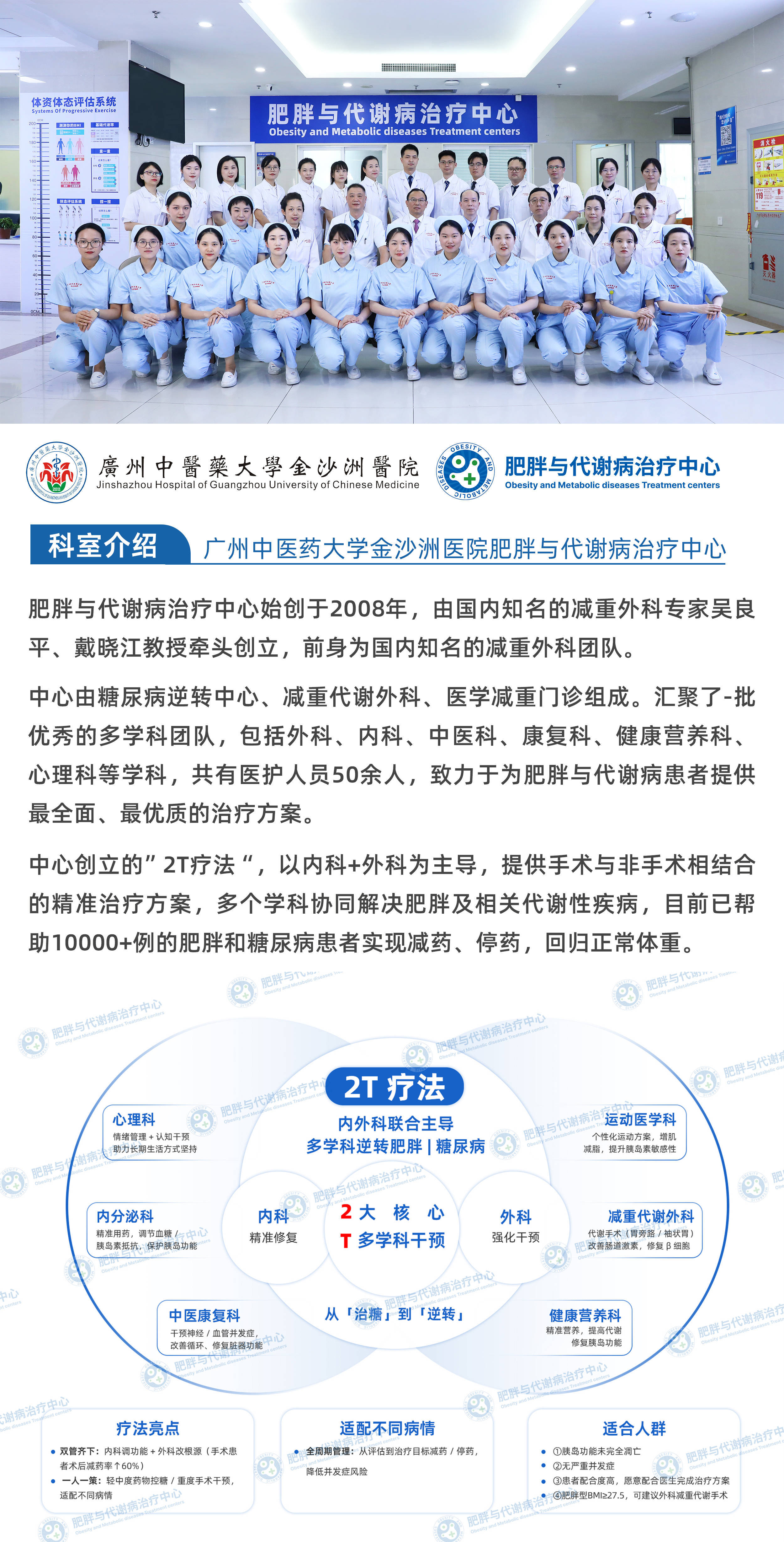 广州中医药大学金沙洲医院肥胖与代谢病治疗中心、糖尿病逆转中心,依托十余年代谢病诊疗经验,以2T疗法为核心形成 预防 - 干预 - 手术 - 康复 的完整服务体系。中心已累计完成近5000余例减重代谢手术,更帮助上万名肥胖和糖尿病患者实现减药、停药,回归正常体重。若您或身边亲友正受肥胖、糖尿病等代谢问题困扰,渴望获取个性化诊疗建议,欢迎联系我们。