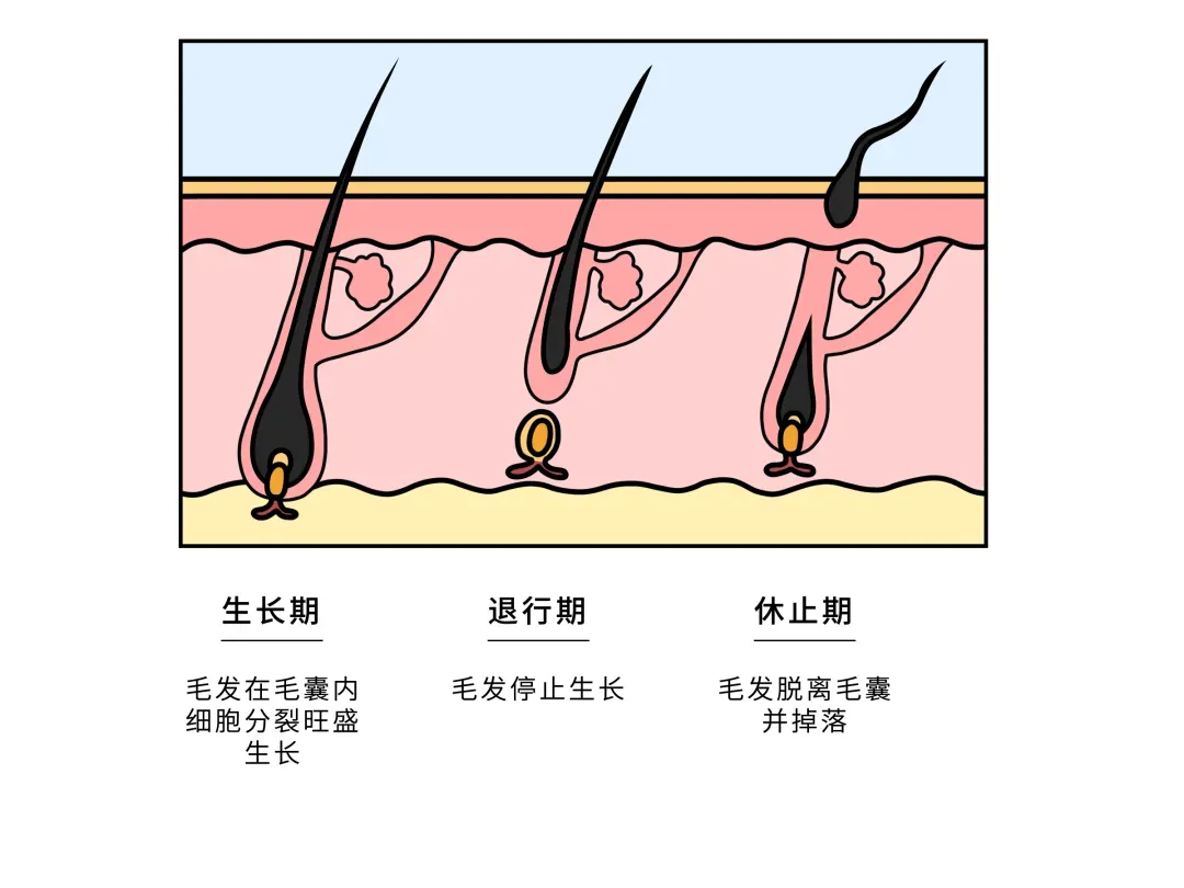 正常头发的生长周期:生长期(2-6年)、退行期(4-6周)、休止期(3-4个月)。正常情况下,90%左右的毛发在生长期(粗壮浓密),1%在退行期(萎缩变细),5%-10%在休止期(毫无踪影)如果休止期毛发增多,那么头发自然而然就稀疏了。