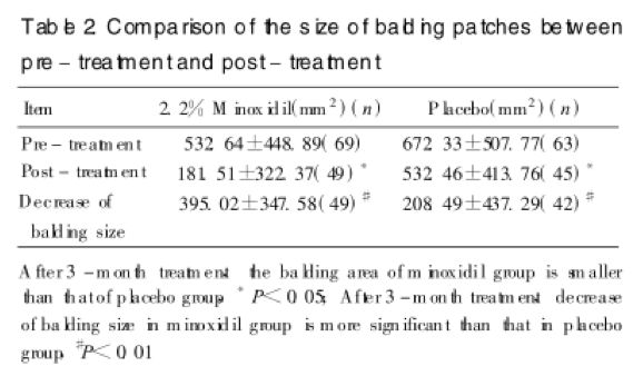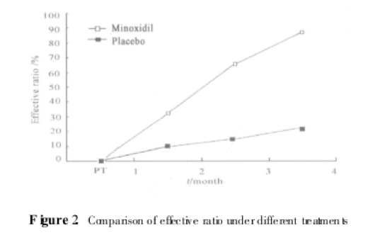 治疗进行到3个月时,2%米诺地尔有效率是20.61%,5%米诺地尔有效率是38.02%