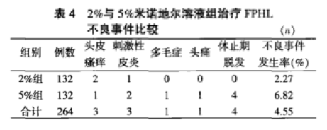 虽然样本不大,但是5%的副作用比2%的副作用高出3倍左右,而且大家注意5%的米诺地尔会出现休止期脱发的例子,这就是大家常说的狂脱期,2%用药发生狂脱期的几率也小于5%用药。