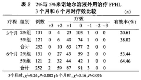 治疗进行到6个月时,2%米诺地尔有效率是38.02%,5%米诺地尔有效率是64.46%