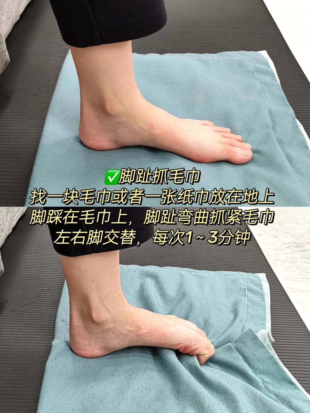 ⭕毛巾拉伸:用弹力带或毛巾绑在脚前掌用力拉,同时脚上勾,保持小腿绷紧,坚持30秒,十次为一组,每天两组;缓解疼痛。