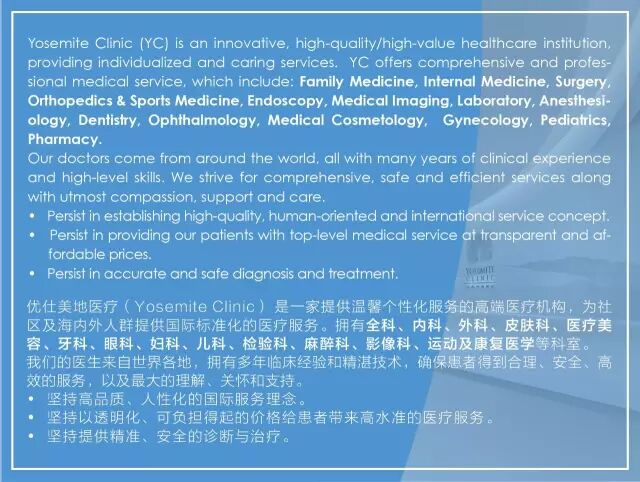 Mon - Fri: 9:00-18:00Sat - Sun: Appointment周一至周五:9:00-18:00周六至周日:接受预约information@yosemiteclinic.comwww.yosemiteclinic.com
