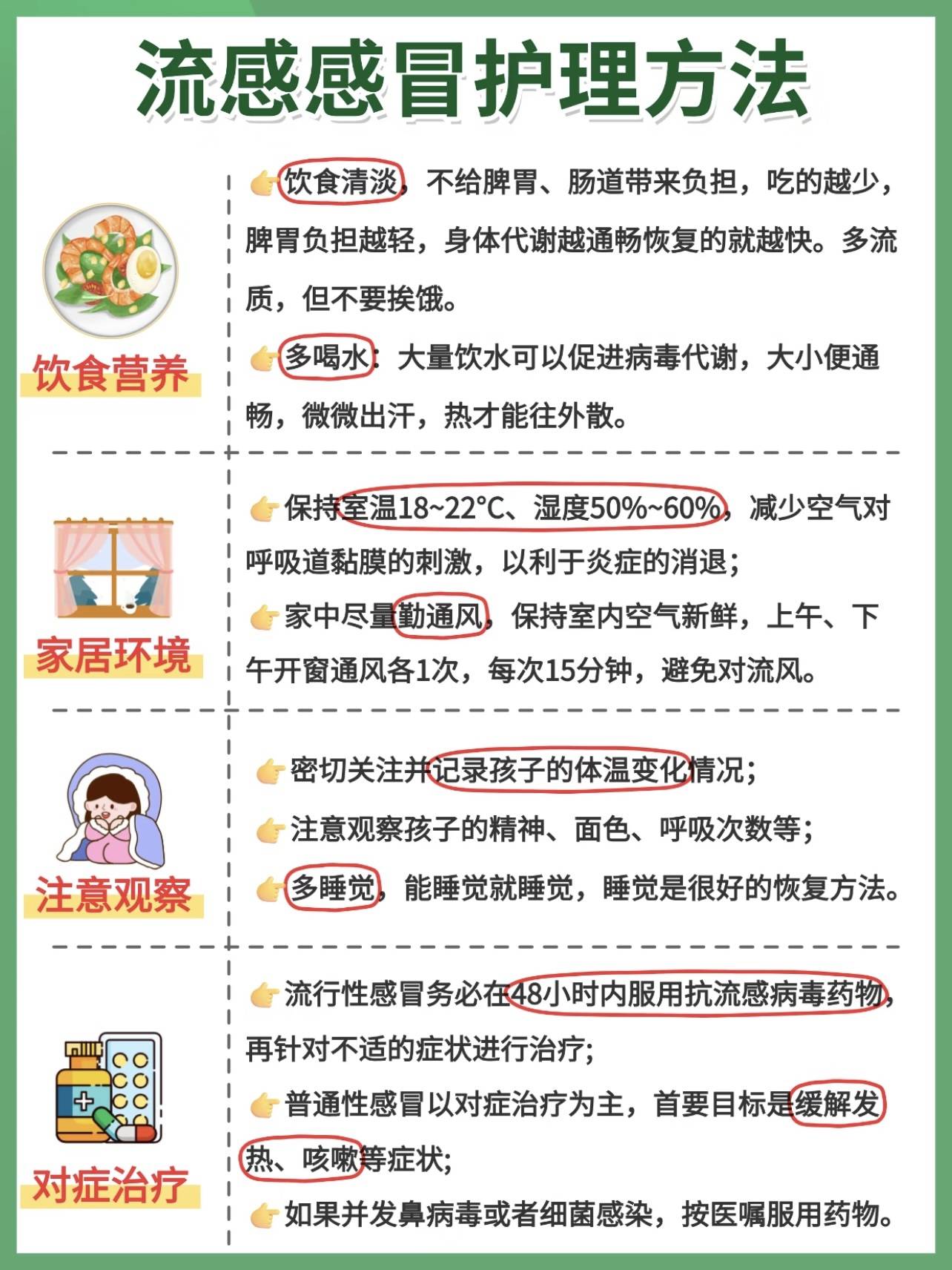 分情况对症下药,普通感冒:轻护理+观察,多喝温水、淡盐水,吃清淡易消化的食物(如粥、面条、蒸蛋),避免辛辣、油腻。保证充足睡眠,避免剧烈运动。低热时物理降温(温水擦浴、退热贴),高热时用对乙酰氨基酚或布洛芬;咳嗽严重可用止咳糖浆(需遵医嘱)。提前预防,勤洗手、戴口罩,避免去人群密集场所。流感的紧急护理+防并发症,确诊后居家隔离至退热后24小时,避免传染家人。每天喝2000ml以上水(包括淡盐水、蜂蜜水),观察尿液颜色(深黄需增加补液量)。48小时内用奥司他韦(需医生处方),高热时用退热药,咳嗽严重可用雾化治疗。每4小时测体温,若持续高热≥3天、呼吸急促、精神萎靡,立即就医!支原体感染是一场持久战护理,保持室内湿度50%-60%(用加湿器),避免干燥刺激呼吸道。多吃润肺食物(如雪梨、百合、银耳),避免甜食、油炸食品。遵医嘱用阿奇霉素(吃3天停4天),咳嗽剧烈时可用氨溴特罗口服液。个人用品单独清洗,避免亲密接触(如共用餐具、亲吻)。