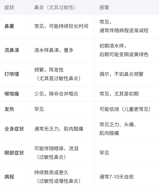 鼻炎:症状可能季节性发作(如花粉过敏)或常年存在(如尘螨过敏)。脱离过敏原或使用抗组胺药后症状缓解。感冒:可能伴随咳嗽、全身不适,传染性强。通常需对症治疗(如退烧药、休息)。如何判断?