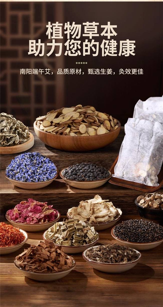 成分包括艾叶、益母草、红花、丹参、桂枝、桑枝、干姜、女贞子、芍花、伸筋草、薰衣草、山药、鸡血藤等多种珍贵药材。艾叶温经散寒、促进循环,驱散体内深层寒邪,缓解关节酸痛;益母草利尿消肿、辅助祛湿,改善身体发沉、浮肿、大便粘腻;红花活血通经、化瘀通络,增强祛湿散寒效果,改善面色暗沉;丹参协同促进气血运行,让调理更彻底;桂枝温通经络、排出湿寒,补充体内阳气,药性温和适配各类体质;桑枝缓解湿寒引发的关节僵硬,舒缓久坐后的肌肉紧张;干姜增强阳气、抵御湿邪,长期使用也不会上火;女贞子兼顾整体调理,平衡配方温和度,同时辅助滋养肝肾、健脾养胃;芍花平衡气血,改善精神不振、面色蜡黄;伸筋草舒缓肌肉紧张,尤其适合久坐人群;薰衣草放松身心、舒缓安神,缓解熬夜疲惫,帮助改善睡眠;山药调理脾胃,从根源减少湿寒入侵;鸡血藤增强气血循环,改善体虚多汗、手脚麻木。多种药材形成祛湿矩阵,每一味药材真材实料,不打粉,拒绝廉价碎料以次充好,黄金比例配方,让湿寒无处遁循。