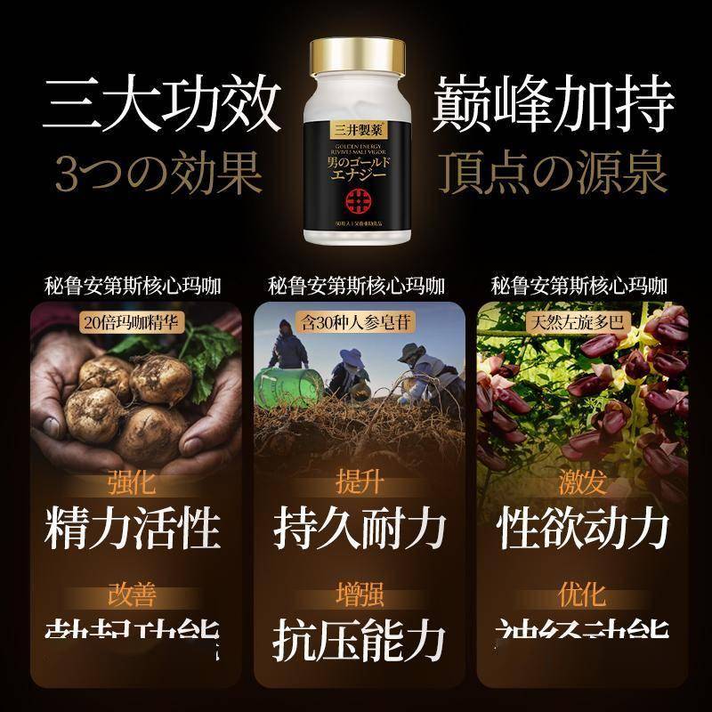 在高纯玛咖浓缩精华的基础上采用多种科学复配,针对男性核心问题(时间、硬度、敏感)、身体机能下降(精子质量差、腰酸腿软、前列腺炎)、外在形象问题(发际线后移、黑眼圈严重、啤酒肚)、心理阴影(战前焦虑、房事推脱)等全方位男性困扰,每种成分各司其职,协同增效释放真男人潜能,实现1+1>2的协同增效效果。