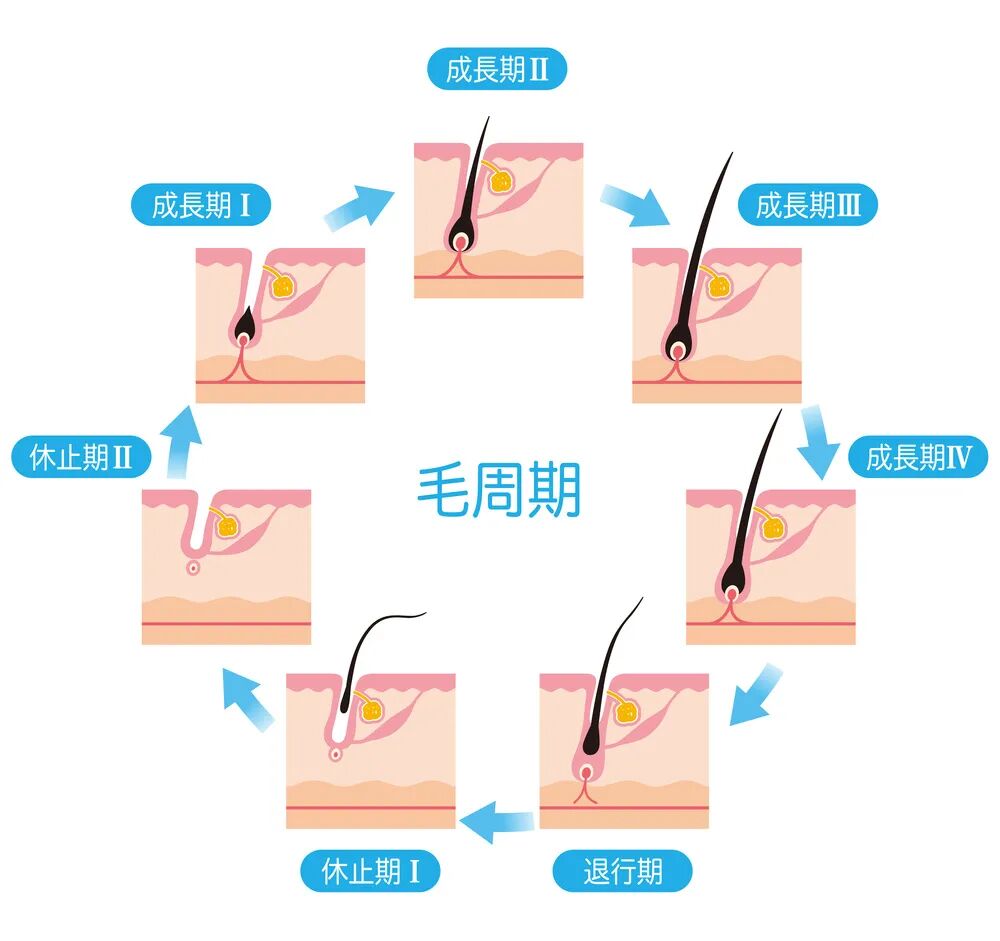生长期就是成长阶段,变长变强壮;退行期就是成长到一定阶段后,它就会停止了生长,保持原样;到了休止期的时候,头发就会自行脱落了,呈现出来的就是我们日常规律的掉发。