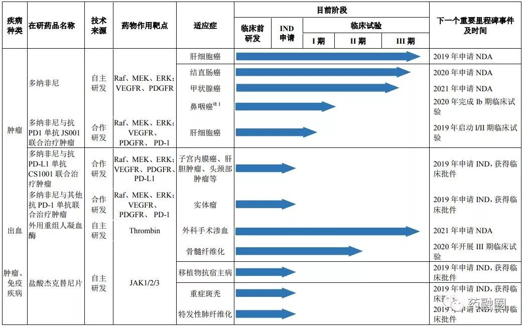 产品线中进度最快的为多纳非尼(氘代索拉非尼),目前正在三期临床中(晚期肝癌一线治疗、晚期结直肠癌三线治疗和治疗局部晚期/转移性放射性碘难治性分化型甲状腺癌),专利2032年到期。多纳非尼仅肝细胞癌适应症开发整体预算投入为2.56亿元。