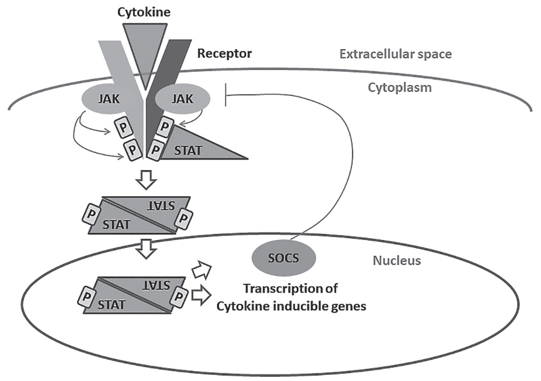 配体(如白细胞介素)与受体结合导致二聚化,从而通过磷酸转移激活JAK蛋白。JAKs使受体胞内区域的酪氨酸分子磷酸化,从而使STATs结合。JAK磷酸化STATs,使其解离并易位至细胞核,从而通过DNA转录调节基因表达。每个受体都与特定JAK或JAK组合,这些JAK激活特定的STAT,导致各自基因转录。细胞因子信号转导抑制因子(SOCS)作为负反馈并负责级联终止。该通路的关键组成部分如图2所示。