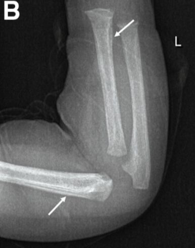 图2 X线显示肱骨、桡骨、尺骨骨皮质增厚、洋葱皮征