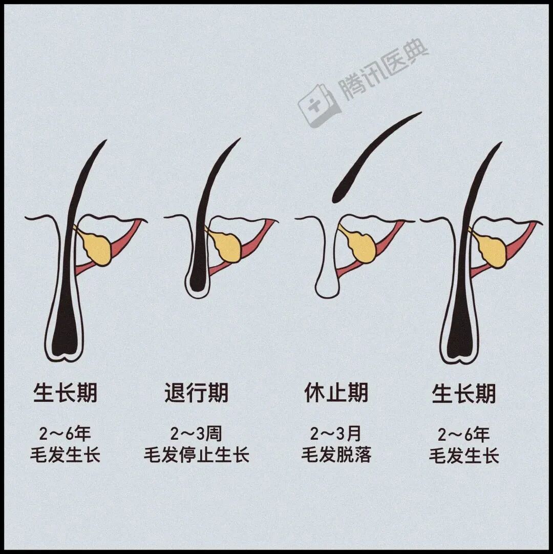 正常情况下,毛发经历生长期、退行期和休止期,当斑秃发生时,毛囊进入了休止期,停止生长和新发的形成,导致脱发。