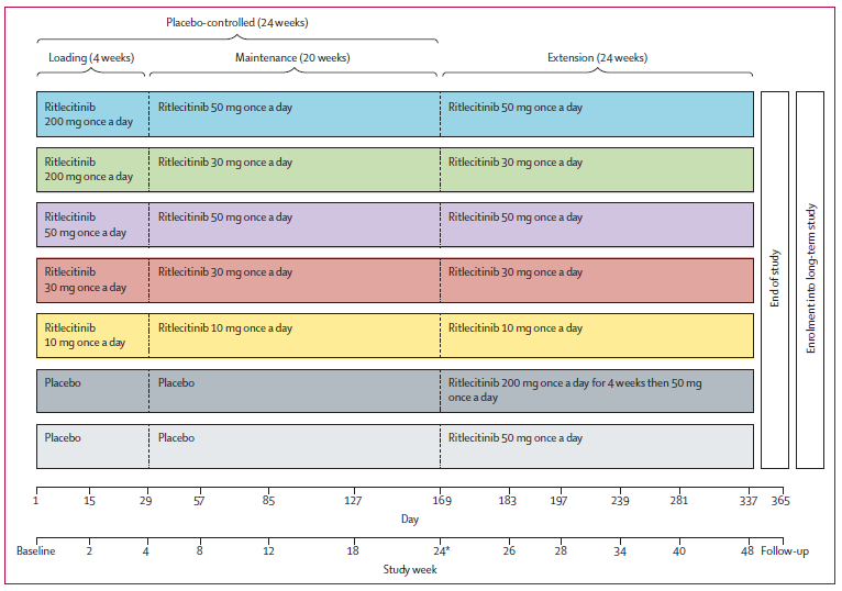 利特昔替尼胶囊本次获批主要基于一项全球多中心的IIB/III期试验——ALLEGRO研究。研究方案及分组如图3,共招募718例≥12岁青少年及成年患者(斑秃情况:至少有50%的头发因斑秃而脱落),随机分为7组,每日口服1次利特昔替尼胶囊或安慰剂,进行24周维持治疗(含/不含负荷剂量)和24周的扩展治疗。