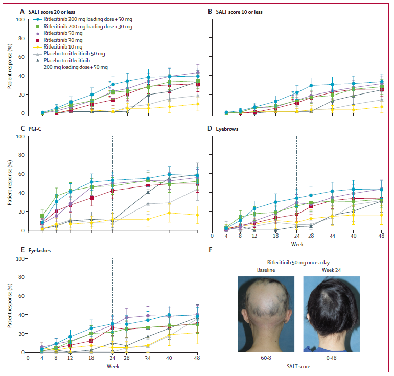 [3] King B, Zhang X, Harcha WG, et al. Efficacy and safety of ritlecitinib in adults and adolescents with alopecia areata: a randomised, double-blind, multicentre, phase 2b-3 trial. Lancet. 2023 May 6;401(10387):1518-1529.