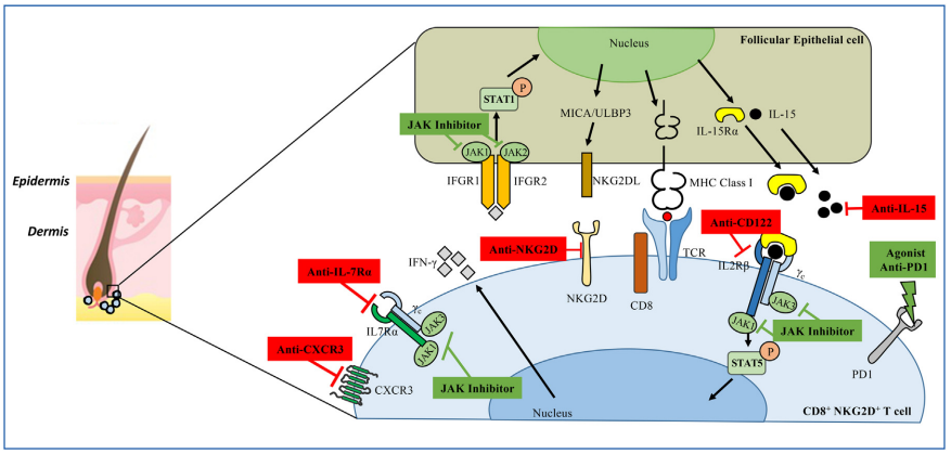 图2 斑秃的免疫机制和潜在的治疗靶点[2]