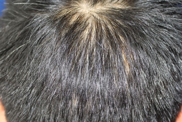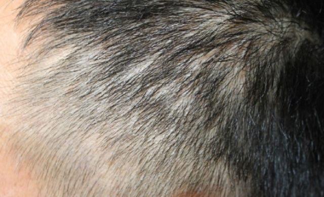 查体:头皮两侧可见脱发斑(见上图),呈虫蚀状,头皮无红斑、鳞屑、萎缩。躯干四肢未见红斑、丘疹等皮损。