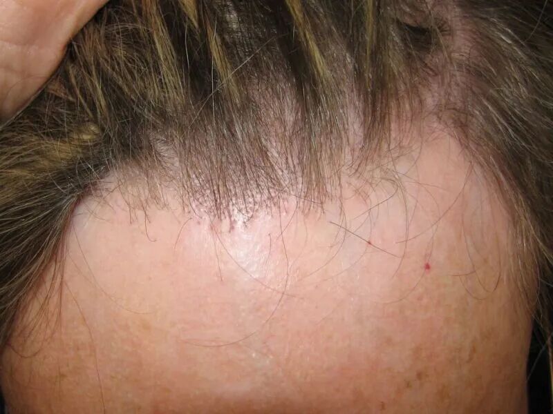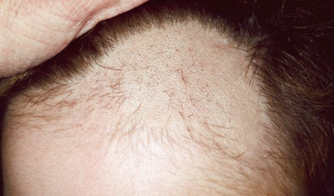 其典型表现是沿前额发际线的渐进性、对称性带状脱发区,眉毛常有变细或缺失。偶尔有面部皮肤受累,例如毛囊周围红斑或毳毛周围丘疹,这可能是脱发的前兆。