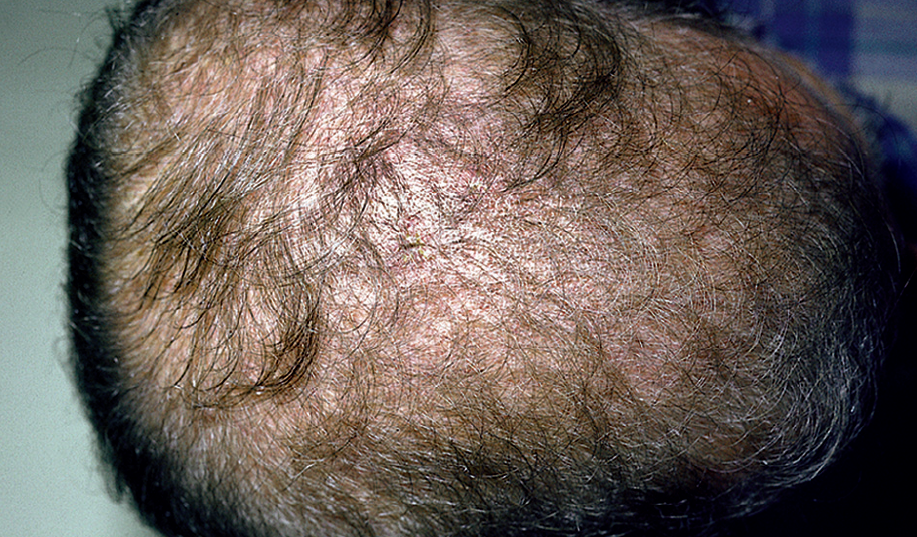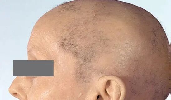 其临床表现是头皮增厚,伴随不同程度的继发性脱发,脱发可呈局灶性或弥漫性。其中,病变区头皮触诊为松软、沼泽样头皮。