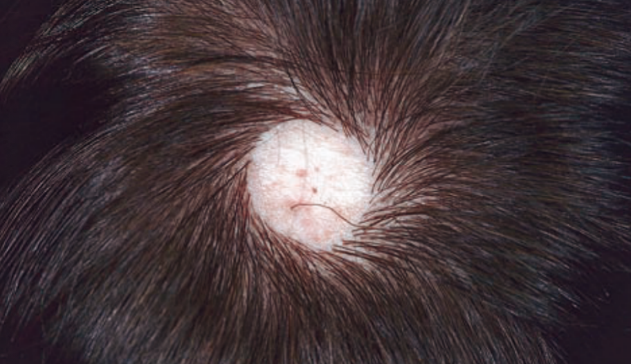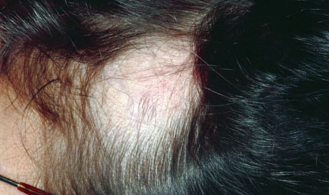 脱发斑内可能存在一些终毛和/或毳毛,或者脱发斑内可能完全没有头发。此外,不会有炎症和瘢痕。