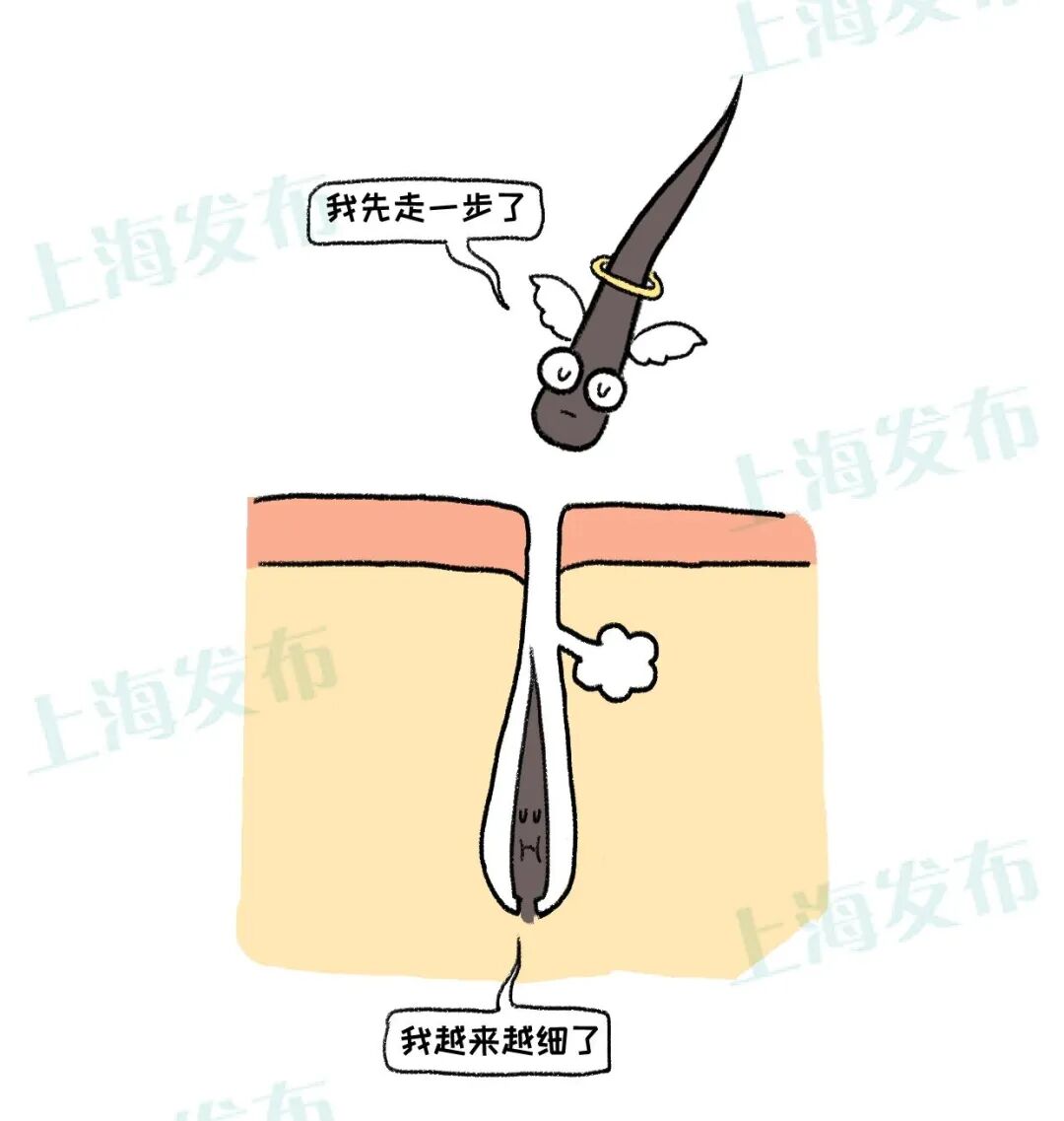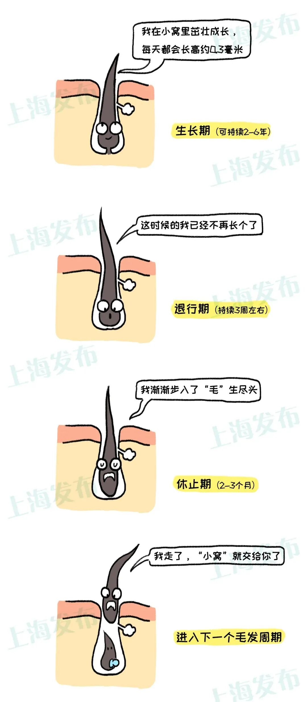 我们日常生活中常会观察到脱发在秋季更明显。这是因为在夏季,进入休止期的毛囊比例增加,经过在100天左右的潜伏期,这部分进入休止期的头发开始脱发,会表现为明显的秋季脱发。这种毛发脱落的季节变化可能源于一种进化优势-毛发只在冬季保证头皮温暖,而夏季过度日晒后毛发脱落。
