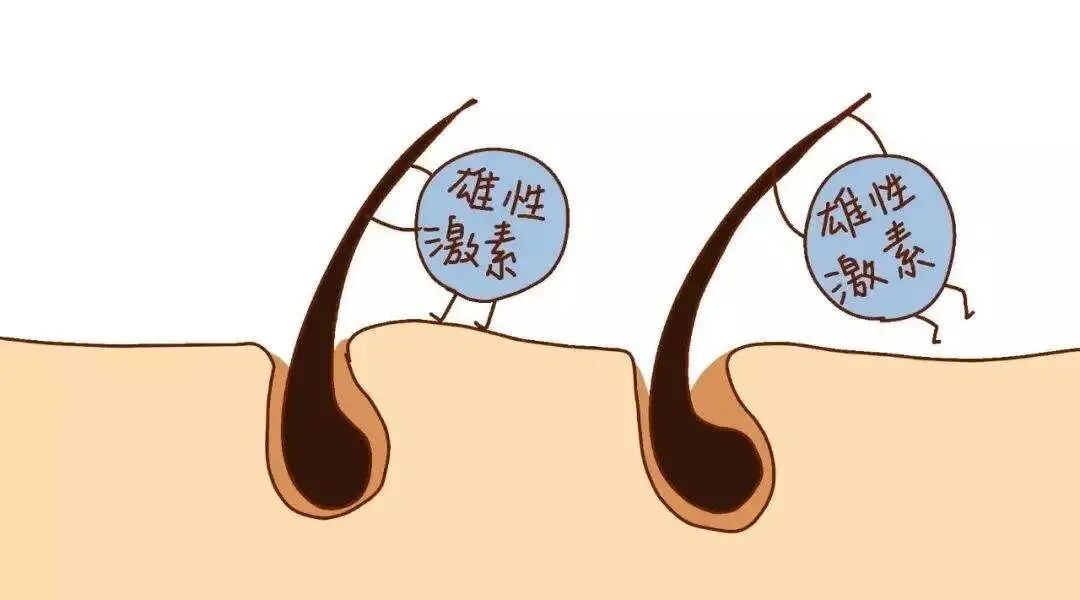 导致雄激素脱发的元凶就是二氢睾酮,二氢睾酮进一步导致毛囊萎缩、毛发变细、毛发生长周期缩短,粗壮的毛发变成细小的毳毛。