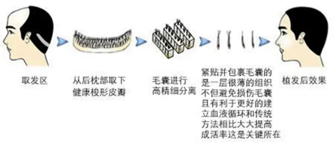 FUT就是植发手术最早被发明时候的手术方案,在你的后脑勺切下来一整条的头皮,然后再从这条头皮里把毛囊一个一个分离出来,再在你需要长头发的部位打孔,然后把毛囊一个一个种进去就好啦!后脑勺的伤口我们再进行整形缝合就行,疤痕以后也会被头发遮住。