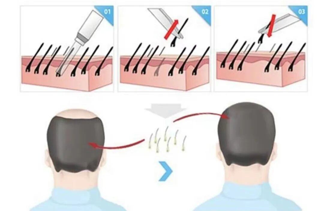 但听起来还是有些可怕哈,切一条头皮下来。所以呢随着技术的发展,FUE植发就出现了。这种方法不需要切取头皮,直接用高速旋转的空心针或者宝石刀,从你后脑勺把毛囊一个一个取出来,再同样打孔,种植到需要的部位就好。相对创伤小,恢复也快,基本上逐渐取代了FUT手术方案了。