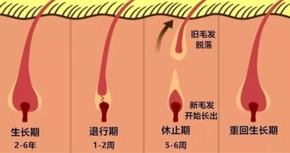 头发的生长期一般持续2-6年,在这期间,头发以每月大约1厘米的速度生长;退行期大约是2-3周,在这期间头发会慢慢脱落;之后是3个月的休止期,毛囊得到充分休息之后,再重新长出新的头发。