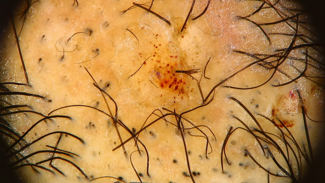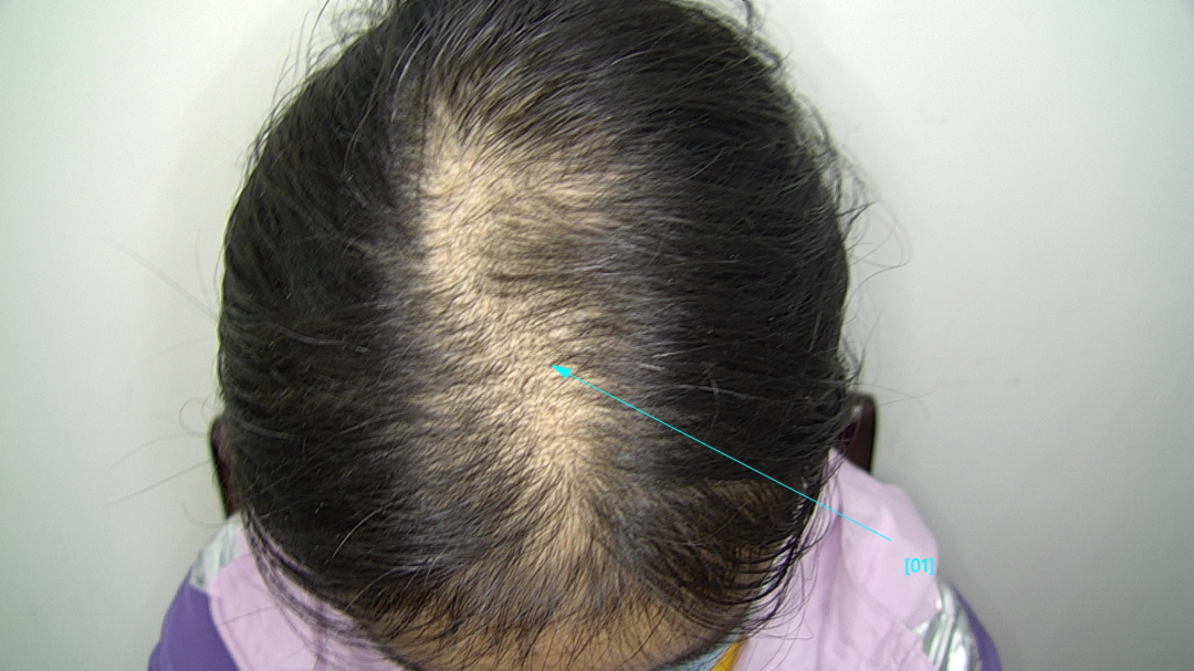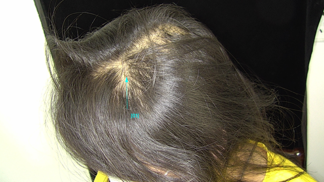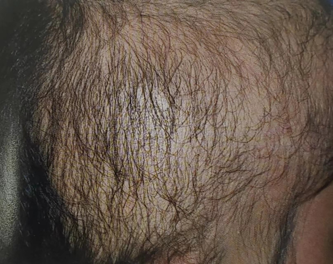 接诊医生通过仔细观察毛发区,发现这些患者都有一个明显的共同点:斑片状的毛发密度降低,毛发长度不一,边缘常不整齐,形状不规则,类似几何图形,中间常残留残存的毛发,拉发实验阴性。