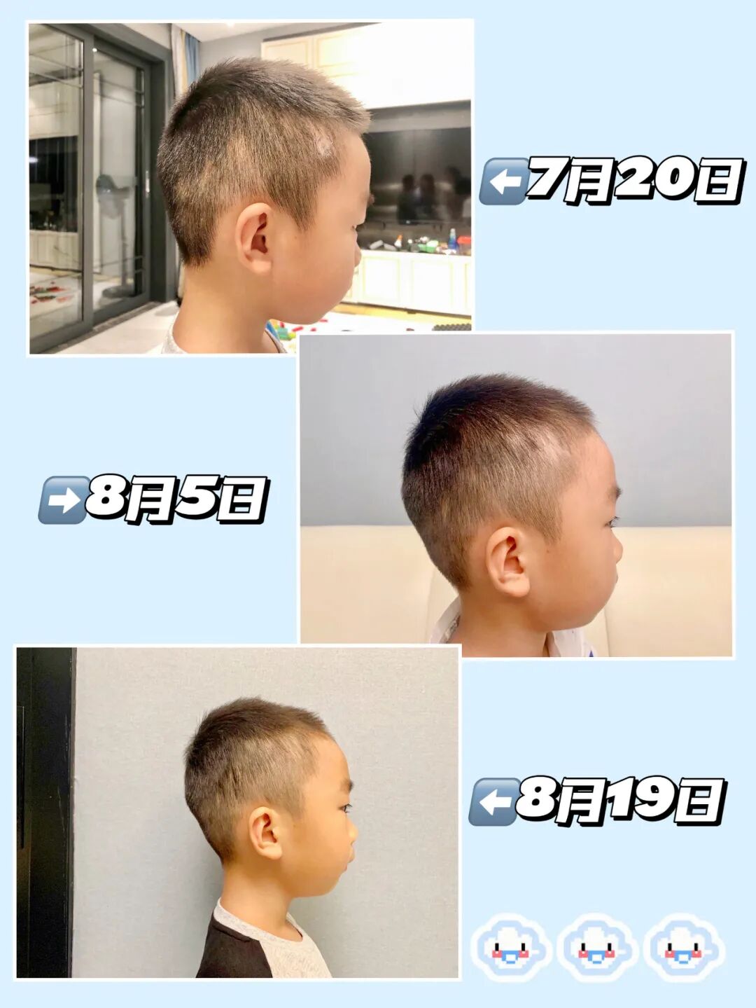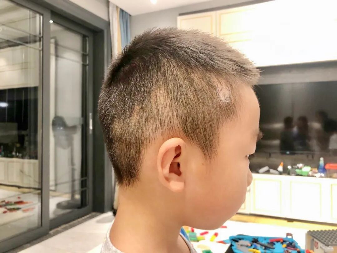 以为是理发师的问题,到了7月份慢慢发现不太对劲,牛牛右侧的头发,坑坑洼洼得越来越明显,而且有蔓延开来的趋势。当天晚上忧心忡忡地查资料,大概确定了牛牛这种情况属于斑秃,去医院看病不是挂儿科和内科,是挂皮肤科。