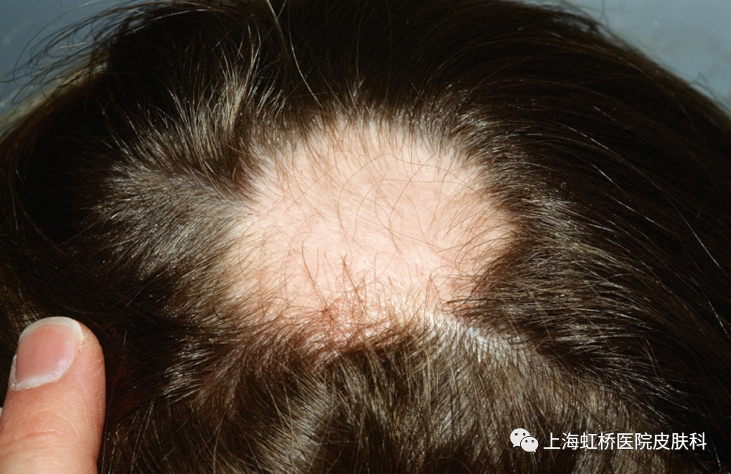 斑秃是一种非瘢痕性脱发,表现为圆形或椭圆形的边界清楚的脱发斑,一般由自身免疫系统错误地攻击自身毛囊从而导致脱发。与成人发病原因不同的是,儿童斑秃主要与遗传密切相关,并且常伴发其他疾病,如:特异性皮炎、白癜风和甲状腺疾病,银屑病等。儿童斑秃一般好发于三岁以上的年纪。