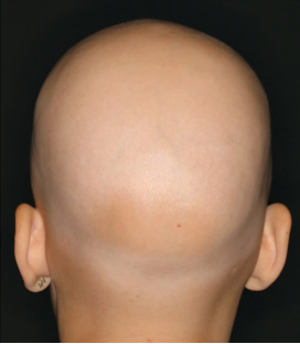斑秃(Alopecia areata,AA)俗称鬼剃头是一种常见的非瘢痕性脱发,流行病学研究显示我国AA的患病率为0.27%,可发生于任何年龄,无明显性别差异。典型的临床表现为突然发生边界清晰的圆形斑状脱发,主要见于头发,也可累及胡须、眉毛、睫毛、阴毛、腋毛以及体毛。皮肤外观基本正常,一般无明显自觉症状。AA根据临床特征可分为以下类型:① 斑片型 (Patchy Alopecia Areata) ② 全秃 (Alopecia Totalis) ③ 普秃 (Alopecia Universalis) ④弥漫型 ( Diffuse Form ) ⑤ 匐行型 (Ophiasis ) ⑥ 中央型(Sisaipho) ⑦ Marie Antoinette综合症(一夜白发 )