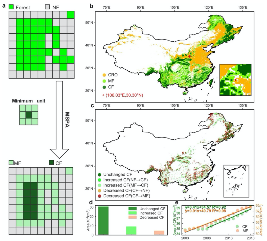 图4 (a) 使用MSPA识别核心林和边缘林。NF、MF 和 CF 分别表示非森林、边缘林和核心林。(b) 2018年CF、MF 和农田 (CRO) 的空间分布。(c) 2018与2003年森林的空间变化。(d) 2003-2018年CF面积变化。(e) 2003-2018年CF和MF面积变化。