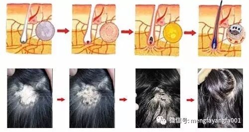 假性斑秃即瘢痕性秃发,发展缓慢,表面呈条形、圆形、椭圆形或不规则形,皮肤萎缩、变薄、凹陷、光亮,紧贴头骨,表面白色或蜡黄色,看不到小绒毛,也看不到毛囊口,几乎全部不能再生新发。