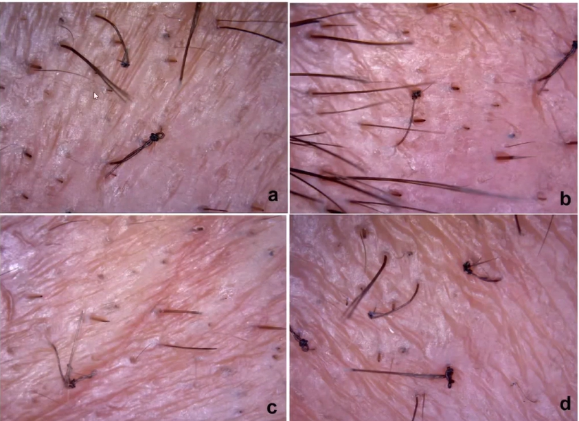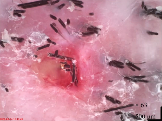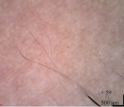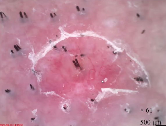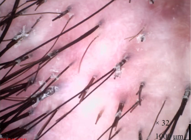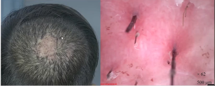 皮肤镜下显示,毛发有断根,部分毛囊长出的头发成束状,剃发后再次做头皮镜,显示以毛囊为中心的黄色点,周围可见线状血管。毛囊分布杂乱,病变区域毛囊缺失,仍无法明确适合疾病。