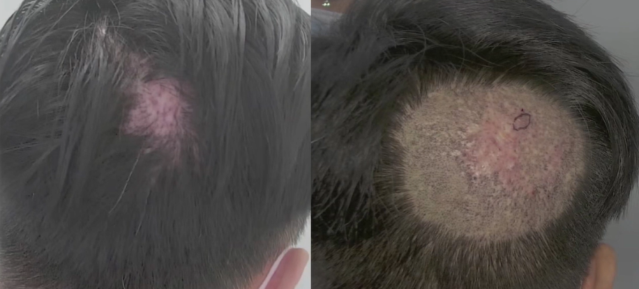 患者治疗2周后复诊,头皮炎症明显好转,周围的头发开始生长。整体的治疗效果还不错。