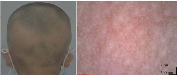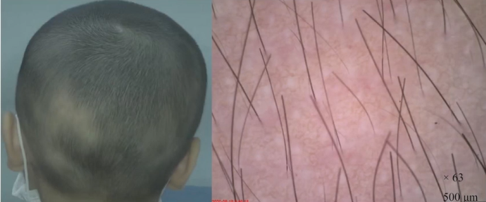 男,3岁,头部可见散在脱发斑,病变区域头皮光滑,无鳞屑及炎症反应,病期2年。