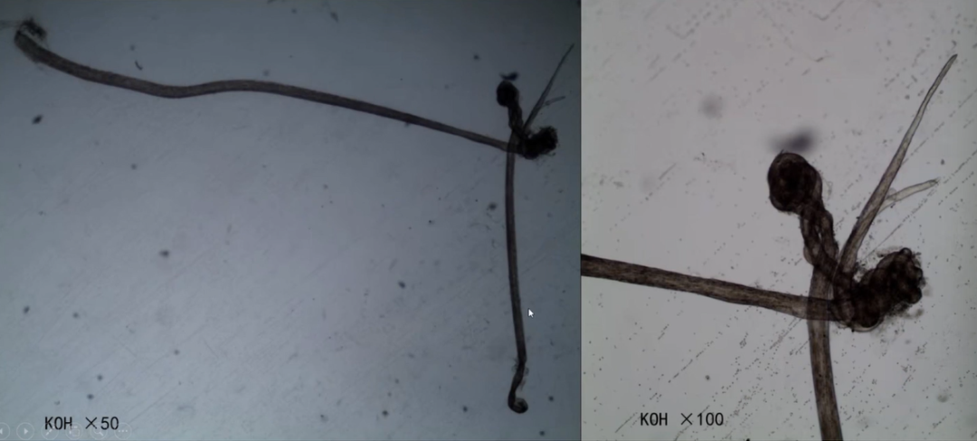 显微镜下显示毛发打圈,猜测是儿童长期捻毛所致。