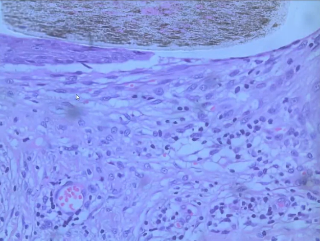 于是取了病变部位做病理检查,枕部表皮大致正常,双毛干、真皮毛囊周围大量浆细胞、淋巴细胞浸润,真皮浅中层纤维结缔组织增生伴血管扩张,血管周围较多淋巴细胞、浆细胞浸润。