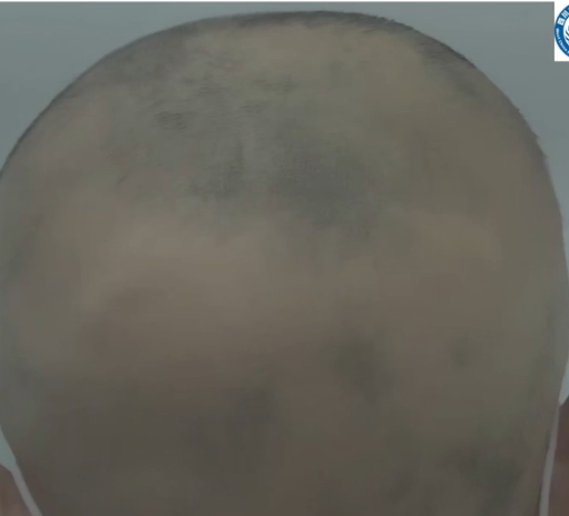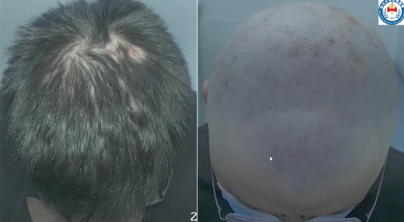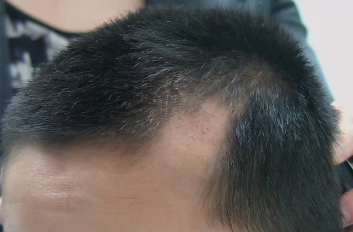 男,32岁,右侧头顶部可见一边界不清的淡红色脱发斑。