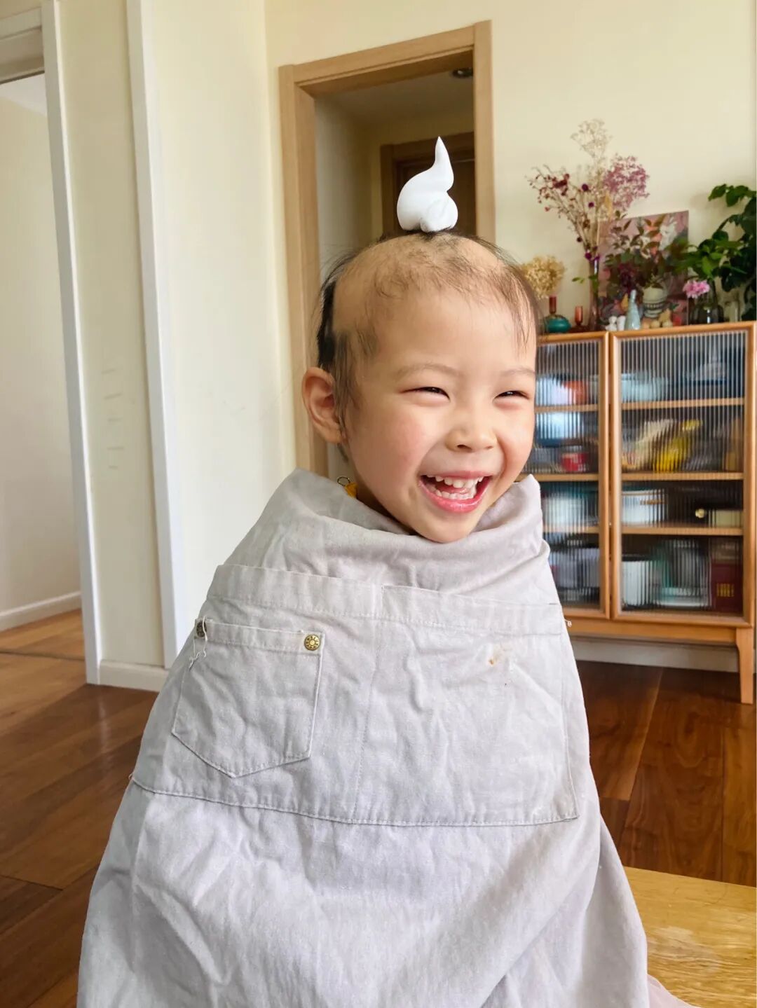上个月,我们给孩子剃头时,用了丈夫的剃须泡,把它们挤在孩子的头顶上时,就像一堆白色的便便,我们一边说,一边拍照给孩子看,一家人笑作一团。