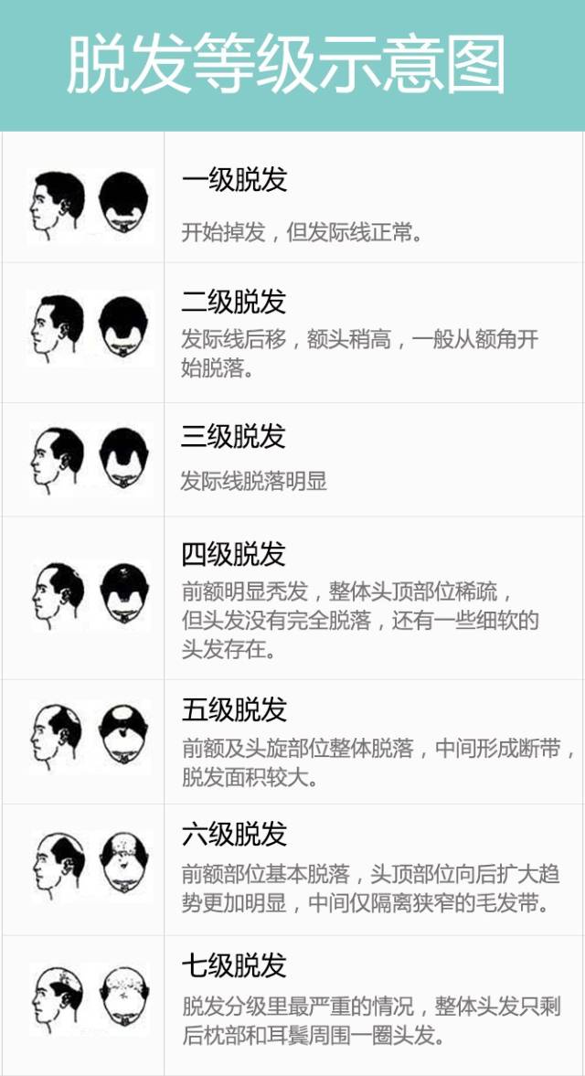 按照脱发程度,可分为7级,从1到7程度递增。如何区分?↓↓对照一下吧!