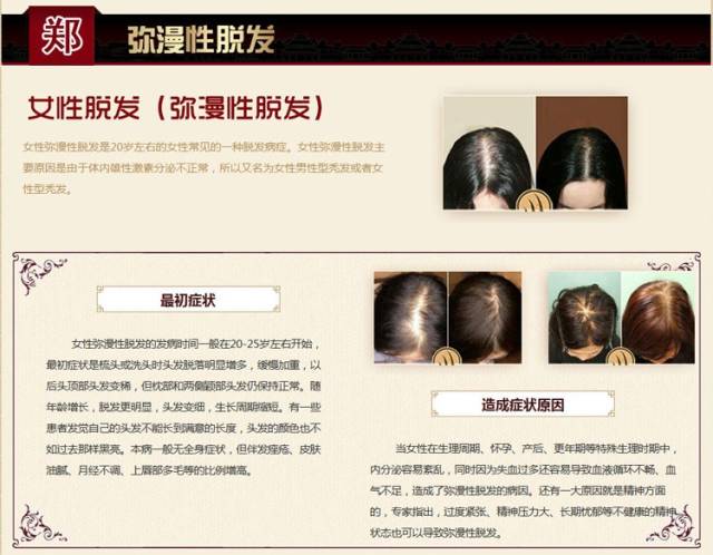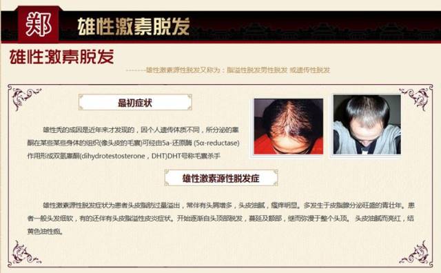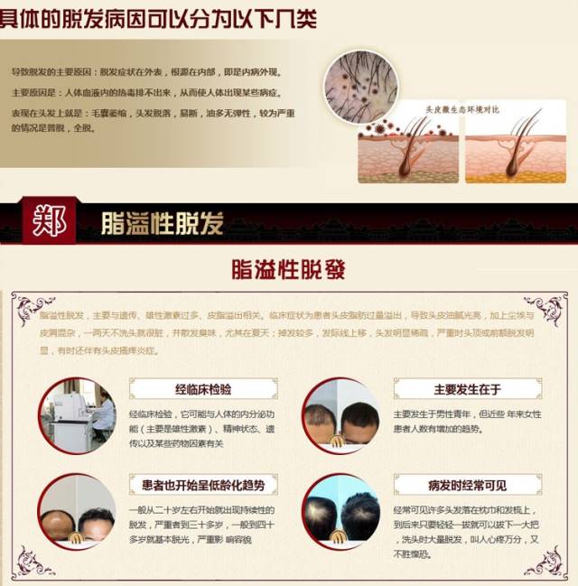 1、脂溢性脱发:发质软,头发油腻,头屑痒,脱发呈W型