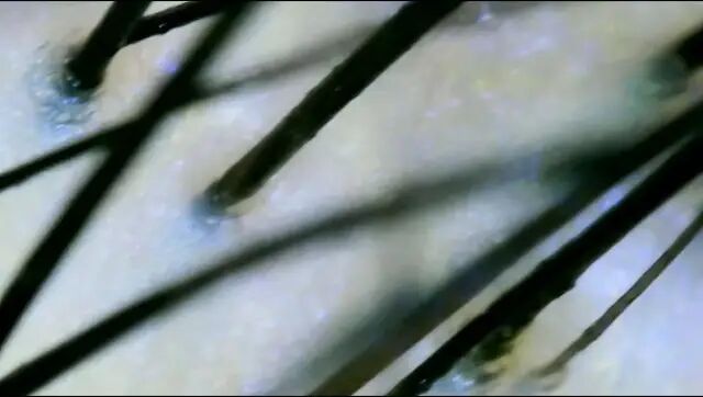 用电子显微镜先看了一下我头皮的情况,后脑勺的部分都还挺好,重灾区是中间发缝的位置,还有就是靠额头一些的头皮位置有点泛红、油脂分泌较多,大部分毛囊还挺健康,一个毛囊里面可以长出2-3根头发,简单的截个图。