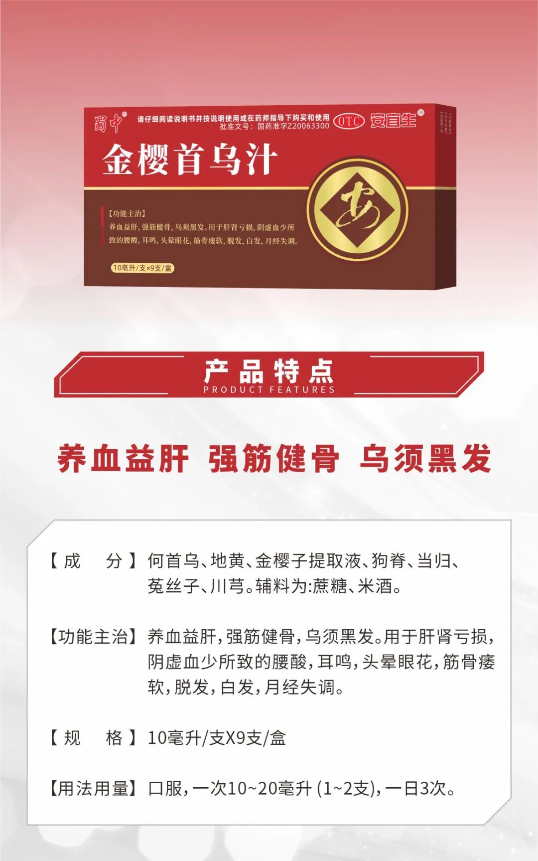 金樱首乌汁集黑发、生发、防脱发三大功效为一体,使用一段时间后,变黑的头发不再白,永远让您拥有一头黑亮的秀发。同时还可改善视力、调节心率、调节血压、增加脑血流量、补充精力的作用。
