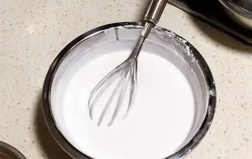 步骤三:粘米粉调成粉浆,一般来说粘米粉和水的比例为一比一,也就是300克粘米粉,加大概300克左右的水调成略黏稠的粉浆。