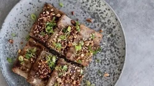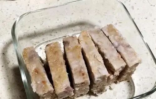 步骤六:芋头糕蒸好以后,记得一定要等它摊凉后,再脱模具!因为糕还是热的时候质感会比较软,容易变形,这时候脱模的话芋头糕会走形。脱模后,就可以切成自己喜欢的厚度和大小。切好的芋头糕加热一下就可以吃了,加上酱油,辣椒酱和其他你喜欢的酱料会更好吃!